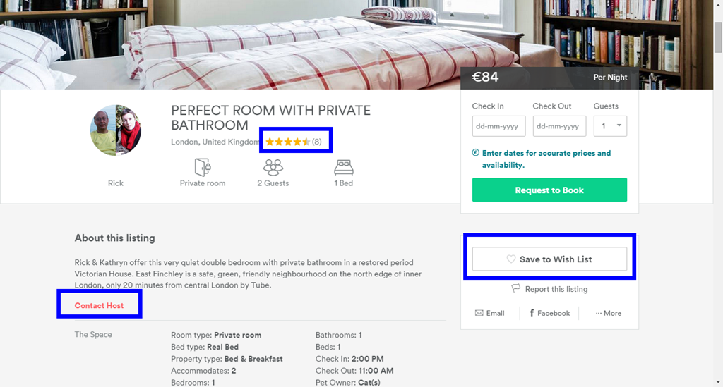 下圖也是Yvonne之前住過的Host頁面,他們家在倫敦地鐵站East Finchley附近,夫妻兩人都超級好,會主動跟你聊天問候,但你在房間的時候也會留給你絕對的隱私。房間不大,但房門外就是給房客專用的浴室,缺點是房間在三樓,行李很多的話就會崩潰,當然男主人Rick還是很樂意幫忙的(人好到連很遠的超市都載Yvonne去),走道地鐵站約十分鐘,進市中心半小時左右,會提供早餐,推薦給大家囉!